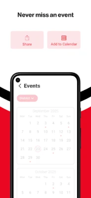 NEVER MISS AN EVENT The event section shows a list of events throughout the district. Users can add an event to their calendar and share the event with friends and family with one tap.