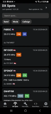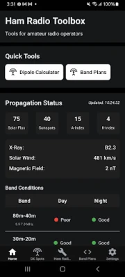 📡 Live Propagation Reports: Stay on top of real-time HF and VHF propagation conditions. 🌎 DX Spots: Track and filter worldwide DX spots from popular clusters. 🛠️ Dipole Calculator: Quickly calculate the ideal lengths for your antennas. 📈 Band Maps: Visualize active bands and make smarter contacts. 🔧 Additional Tools: Sunrise/Sunset, Grid Locator, Prefix Lookups, and more.